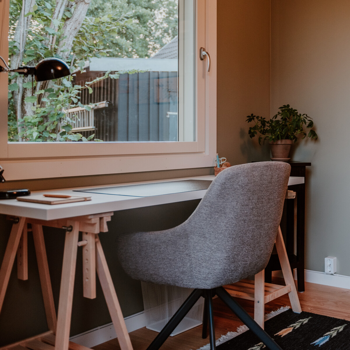 Lilla Studion har dämpad akustik och semi-ljudreducerande väggar, dörr och fönster. Med ett stort fönster och tiltbart skrivbord är den ideal för visuell konst såväl som alla former av kreativt arbete. Inspelningsutrustning och instrument finns att låna vid behov. Storlek: 8 kvadratmeter.