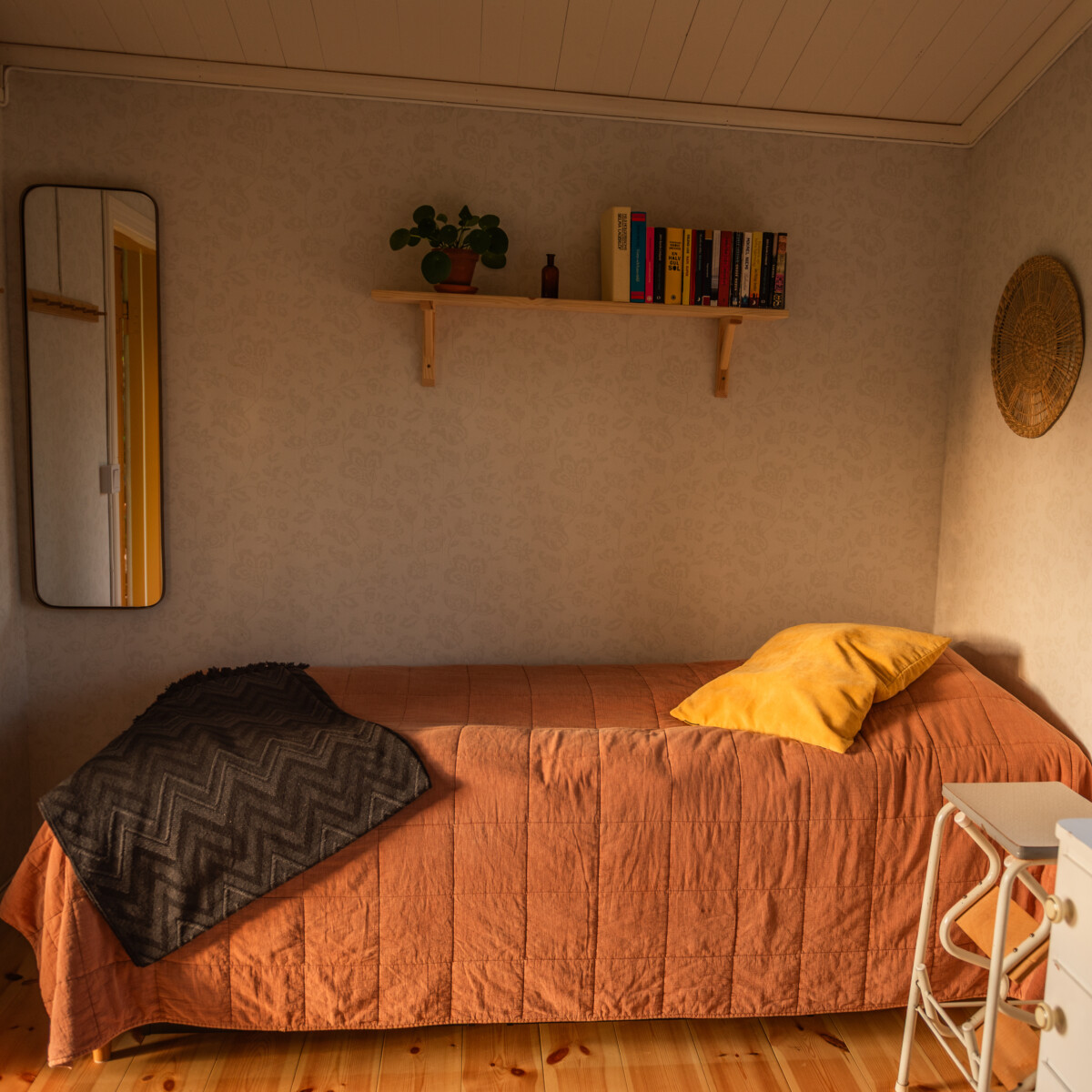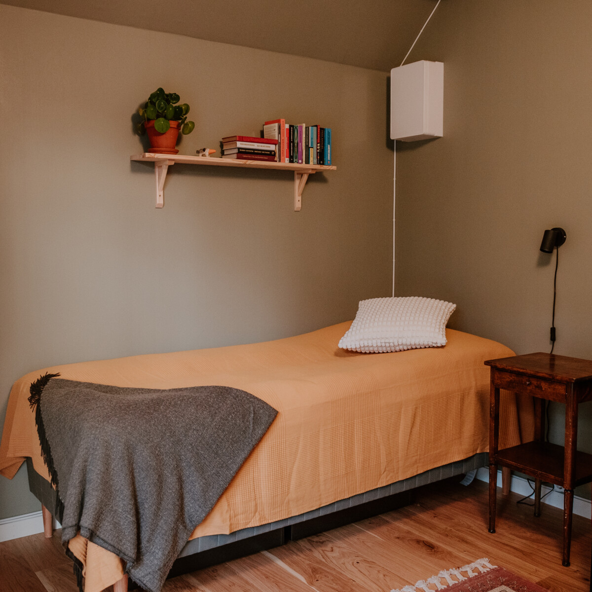 Alla tre studios har en säng, sängkläder, handdukar, skrivbord, stol, klädförvaring och wifi. De är placerade ca tio meter från huvudbyggnaden där toaletten finns.